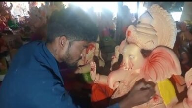 सोलापुरातील छत्रपती संभाजी महाराज तलाव जवळील राजस्थानी कलाकारांकडून गणरायाला फिरवला जात आहे शेवटचा हात…