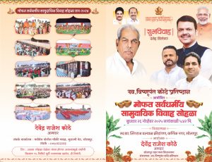 स्वर्गीय विष्णुपंत कोठे प्रतिष्ठानच्या वतीने मोफत सर्वधर्मीय सामुदायिक विवाह सोहळ्याचे आयोजन करण्यात आले आहे. यंदाचे हे दुसरे वर्ष असून बुधवार दिनांक 26 नोव्हेंबर 2025 रोजी संध्याकाळी 05 वाजून 42 मिनिटे या गोरज मुहूर्तावर हा विवाह सोहळा पार पडणार आहे. तरी नववधूवरांना शुभाशीर्वाद देण्यासाठी आपण अगत्य येण्याचे करावे असे आवाहन प्रतिष्ठानचे संस्थापक, आमदार देवेंद्र दादा कोठे यांनी केले आहे.