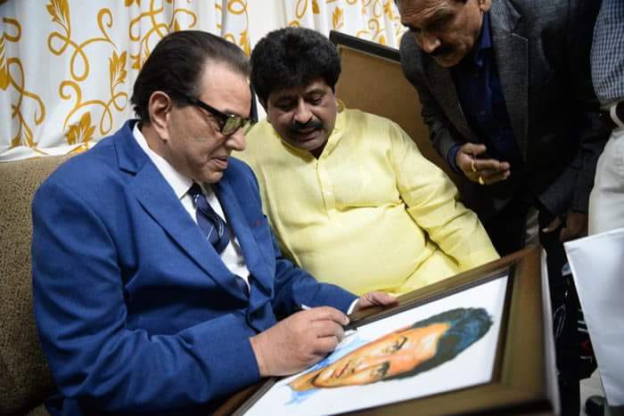 शहर जिल्हा राष्ट्रवादी काँग्रेस शरद पवार पक्षाचे अध्यक्ष महेश गादेकर यांनी प्रसिद्ध अभिनेता धर्मेंद्र यांची दोन अँक्रॅलिक कलर मध्ये पेंटिंग साकारली आहेत.