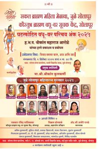 यावेश्री जुळे सोलापुरातील सौ अनिता कुलकर्णी, सौ अश्वीनी कुलकर्णी, श्रीमती अनुजा कुलकर्णी, श्रीमती माधूरी तांदळे, सौ शुभदा देशपांडे, सौ श्रृती बागेवाडी, सौ सुवर्णा पेठे, सौ स्मीता देशपांडे, कु हेमा चिंचोळकर, ॲड शर्वरी रानडे, सौ नमिता थिटे, सौ शैलजा देशपांडे सौ सारीका कुलकर्णी, श्रीमती प्रिया कुंभकोणी यांचा निरपेक्ष निस्वार्थी निरंतर केलेल्या कार्याची दखल घेवून त्यांचा यथोचित सन्मान ह . भ . प . श्री श्रीकांन्त आरोळे महाराज यांचे हस्ते प्रमुख पाहूणे सहयोग ब्राम्हण सेवा संघाचे अध्यक्ष श्रीकांन्त कुलकर्णी व ज्येष्ठ पत्रकार व क्रिडा संघटक रविन्द्र नाशिककर ब्रम्हगर्जना प्रतिष्ठान व भगवान परशुराम जयन्तीचे संस्थापक विक्रम ढोनसळे यांचे उपस्थीत मांगल्य मंगल कार्यालय भारती विद्यापीठ जवळ साईसुपर मार्केट समोर मंगळवार दिनांक 9 डिसेंबर 2025 रोजी सायंकाळी ठिक साडेपाच वाजता कार्यक्रम आहे.