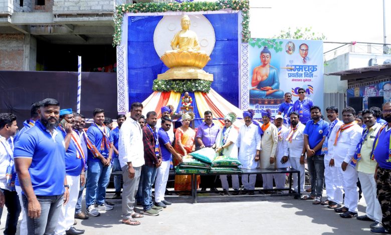 यंदाच्या वर्षी सोलापूर शहर जिल्ह्यामध्ये मोठ्या प्रमाणात अतिवृष्टी झाल्यामुळे नदीकाठी असणाऱ्या गावांमध्ये शेतीमध्ये पूरस्थिती निर्माण झाल्यामुळे अनेक नागरिकांचे व शेतकऱ्यांचे नुकसान झाले यामुळे यंदाच्या वर्षी जी एम संस्थे तर्फे लेझीम ताफा व मिरवणूक रद्द मिरवणुकीस येणारा खर्च टाळून पूरग्रस्त नागरिकांना अन्नधान्य व जीवनावश्यक वस्तूची मदत मागील चार दिवसापासून करण्यात येत आहे आज देखील पाकनी शिवणी या भागातील पूरग्रस्त नागरिकांना अन्नधान्य व जीवनावश्यक वस्तू ची मदत भारतीय जनता पार्टीच्या अध्यक्ष सौ रोहिणीताई तळवळकर यांच्या हस्ते देण्यात आले. या वेळी बोलताना रोहिणीताई तडवळकर म्हणाल्या की डॉक्टर बाबासाहेब आंबेडकर यांच्या संविधानामुळे भारतामध्ये महिलांना अधिकार मिळाला म्हणून मी आज विविध पदे भूषवले आहेत असे बोलून धम्मचक्र प्रवर्तन दिनाच्या निमित्ताच्या सर्व भारतीयांना शुभेच्छा दिल्या व अभार व्यक्त केल्या.