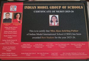 इ. नववी इंडियन मॉडेल इंटरनॅशनल स्कूल हिला शाळेकडून सन 2025 – 26 करिता सर्वोत्कृष्ट विद्यार्थी (बेस्ट स्टुडन्ट फॉर द इयर 2025 – 26) या सन्मानाने सन्मानित करण्यात आले आहे.
