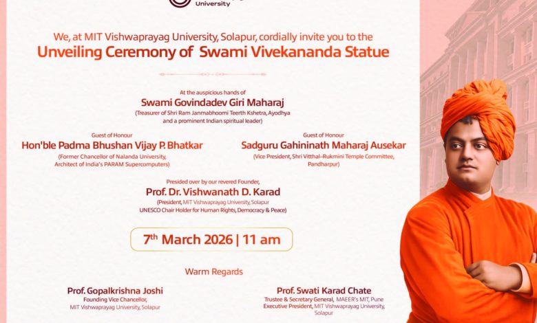राष्ट्रनिर्मिती, युवा शक्ती आणि आध्यात्मिक मूल्यांचे प्रेरणास्थान स्वामी विवेकानंद यांच्या भव्य पुतळ्याचे अनावरण एमआयटी विश्वप्रयाग विद्यापीठामध्ये येत्या ७ मार्च रोजी सकाळी ११ वाजता श्रीराम जन्मभूमी तीर्थ क्षेत्र अयोध्या ट्रस्टचे कोषाध्यक्ष स्वामी गोविंददेव गिरी महाराज यांच्या शुभहस्ते होणार आहे. नालंदा विद्यापीठाचे माजी कुलगुरू आणि ‘परम’ महासंगणकाचे शिल्पकार पद्मभूषण डॉ. विजय भटकर, श्री विठ्ठल-रुक्मिणी मंदिर समिती पंढरपूरचे उपाध्यक्ष सद्गुरू गहिनीनाथ महाराज औसेकर या प्रमुख पाहुण्यांच्या उपस्थितीत व माईर्स एमआयटीचे संस्थापक अध्यक्ष प्रा. डॉ. विश्वनाथ दा. कराड यांच्या अध्यक्षतेखाली हा सोहळा संपन्न होणार आहे. याप्रसंगी एमआयटी विश्वप्रयाग विद्यापीठाच्या कार्यकारी अध्यक्षा प्रा. स्वाती कराड चाटे, विद्यापीठाचे संस्थापक कुलगुरू प्रा. गोपाळकृष्ण जोशी तसेच संस्थेचे विश्वस्त आणि पदाधिकारी उपस्थित असणार आहेत.